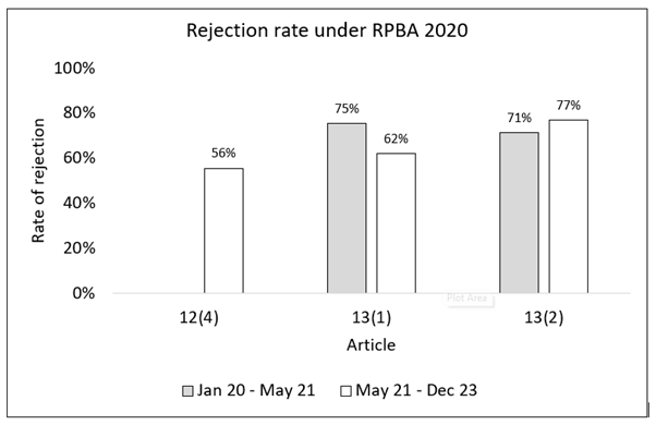 The EIP team has been periodically reviewing how the admissibility provisions of RPBA 2020 are being applied by the Boards. In 2021, we analyzed over 100 decisions involving admissibility between January 2020 and May 2021 to investigate how the new rules were being applied soon after their entry into force. We have now examined 190 further decisions from May 2021 to December 2023 to detect any changes or trends. The overall comparison is shown in Figure 2. Note that the RPBA 2020 contained a transitional provision meaning that Article 12(4) from the RPBA 2007 would still apply to cases filed before 1 January 2020. Thus, we were only able to identify 2 individual applications of Article 12(4) RPBA 2020 in the January 2020 – May 2021 dataset, and, as a result of this small sample size, this data is not portrayed in the figure.