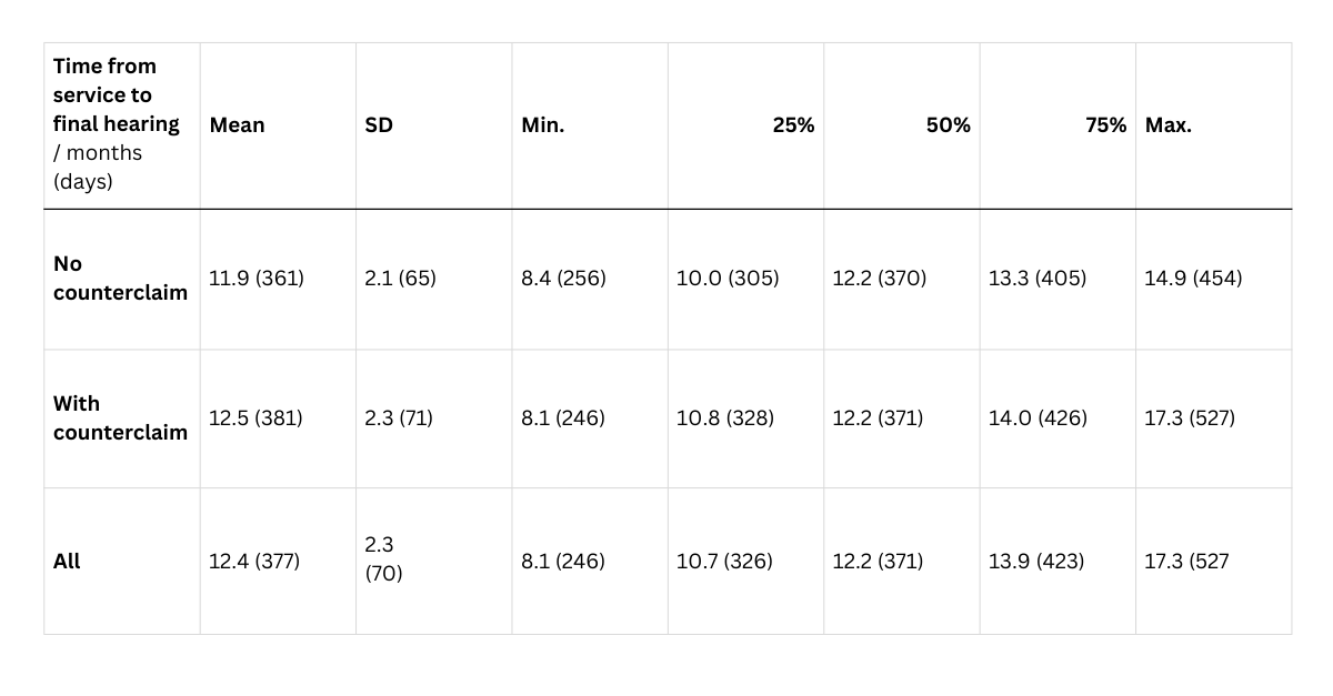 Bearing in mind that this is a new court finding its feet, with many unclear procedural provisions requiring input from the Court of Appeal, it is promising that in 75% of cases the oral hearing was held within 14 months from service of the statement of claim.