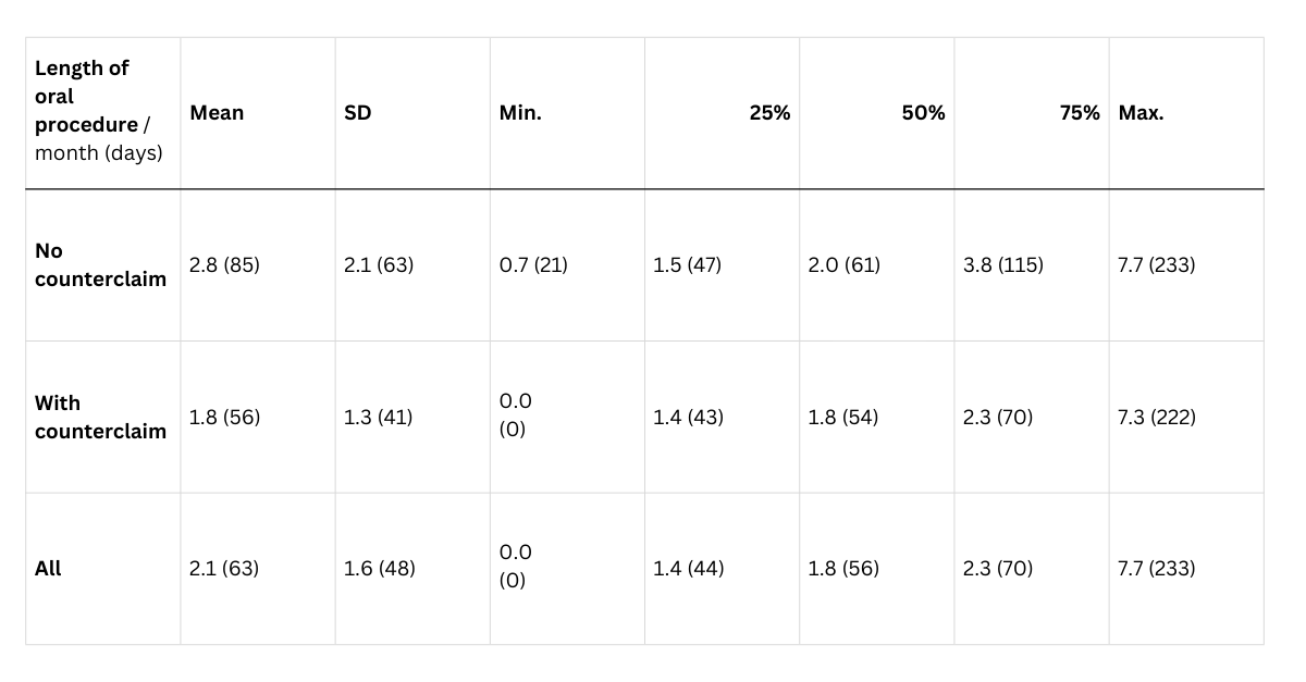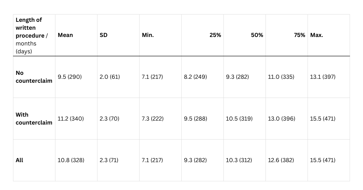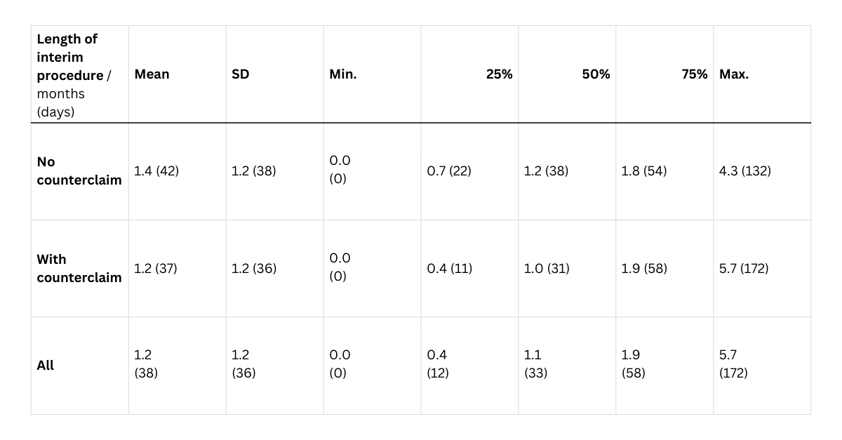 The efficiency of the interim procedure compared to the originally estimated 3 months makes up for much of the slowdown in the written procedure discussed above. As expected, the length of the interim procedure does not seem to be significantly affected by the filing of a counterclaim for revocation.