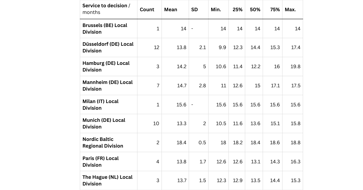 Given the significant differences in workload at the different local and regional divisions, it might be expected that the progress of cases at the busiest divisions would be slower. Furthermore, we have heard repeatedly that the German local divisions have difficulty composing panels of German-speaking judges for actions filed in German. Nevertheless, the differences between divisions do not appear to be significant, as shown below.