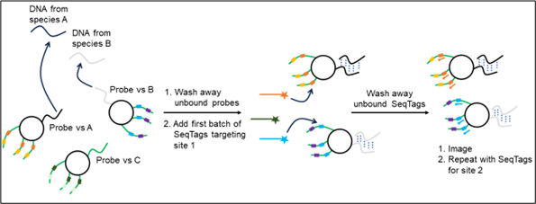 Bound detection reagents are retained and detected by the fluorescence of bound SeqTags, whereas unbound detection reagents are washed away. In Figure 2, species A is detected as first an orange signal then yellow, and species B is detected as blue signal then purple.