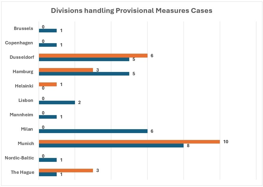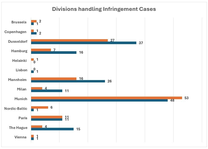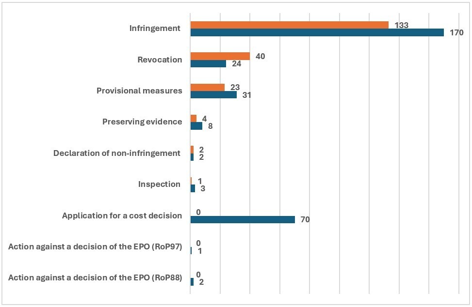 In the charts below, the orange bar represents cases filed from 1 June 2023 to 31 May 2024 (the first year of operation of the UPC), while the blue bar represents cases filed from 1 June 2024 to 31 May 2025 (the second year of operation of the UPC).