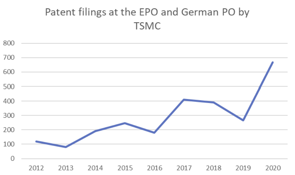 A real risk for the Integrated Device Manufacturers (IDMs) is a surge in patenting activity from the pure-play foundries, in particular on the device side. In fact, we have already seen an increase in patent filings from TSMC in Europe, as can been seen in the chart below.