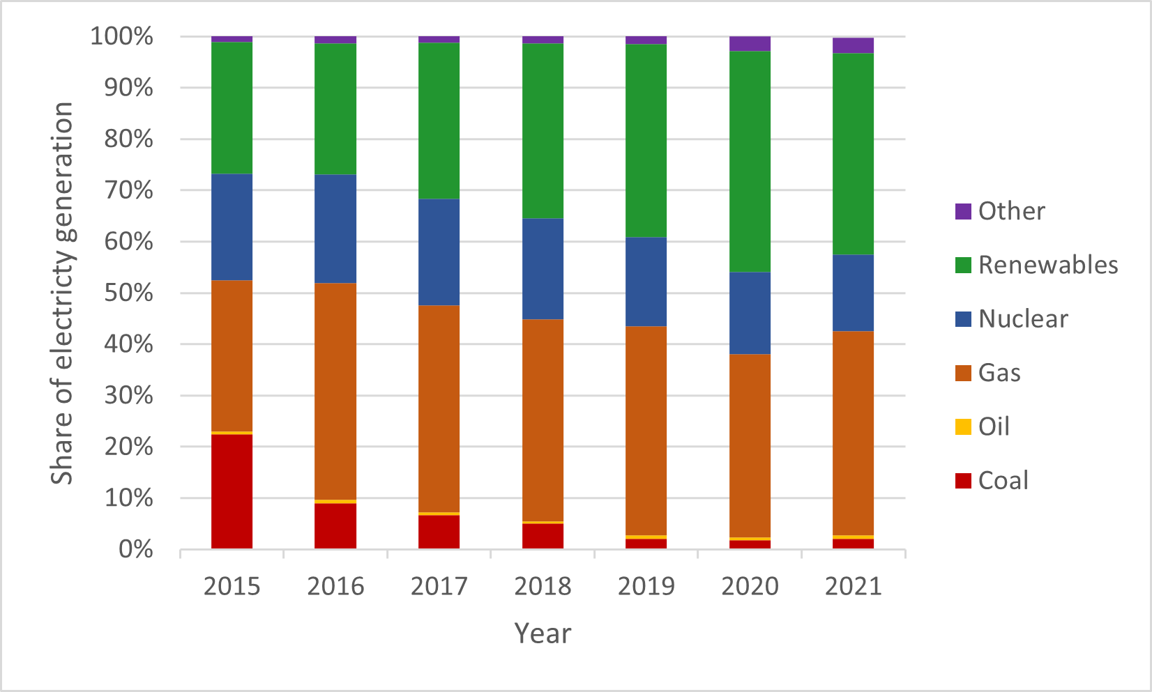 The above table taken from the Digest of UK Energy Statistics (DUKES): electricity (updated 28 July 2022) shows the share of electricity sources of the national grid for the years 2015 to 2021.